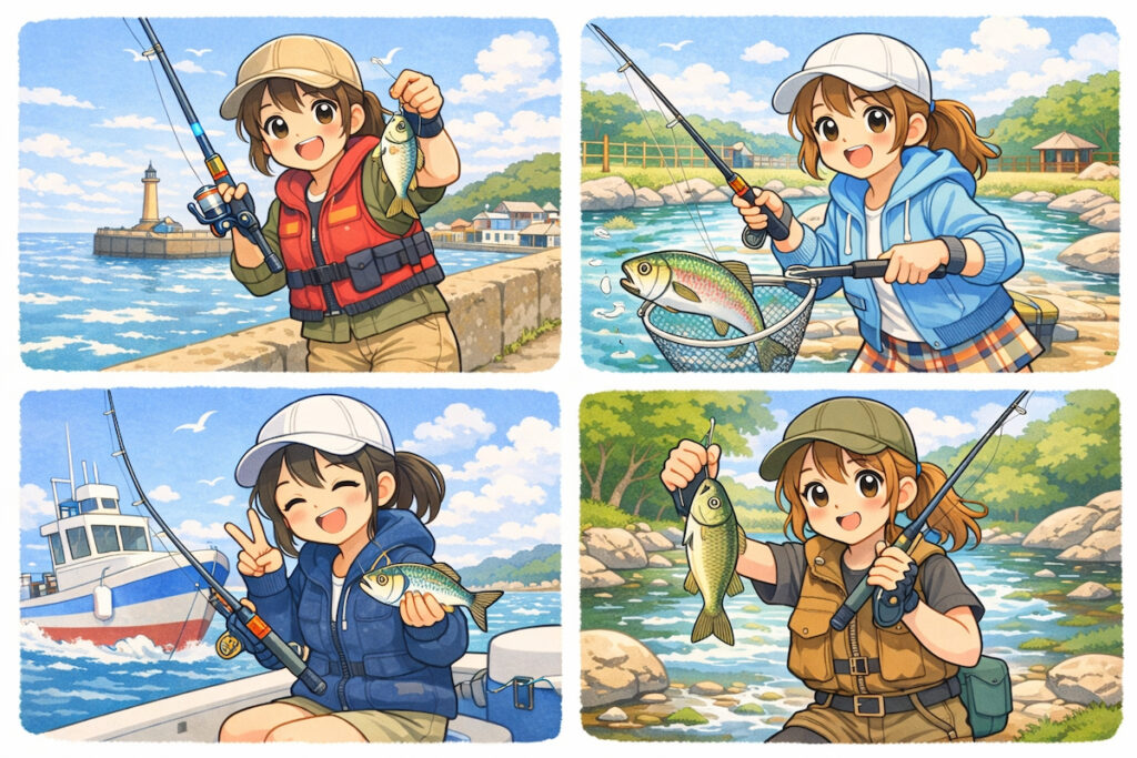 まずは「どんな釣り 女子になりたいか」をイメージすると、道具選びもコーデも決めやすくなります。ここでは、初心者の釣り 女子に人気のスタイルを4つ紹介します。