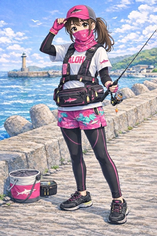 A. 夏場の釣り 女子は完全防備が基本です。帽子・フェイスガード・長袖・長ズボン・UV手袋で「肌を出さない」ことを意識しましょう。
